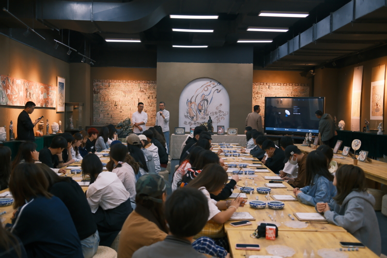 学生们在敦煌书局和印局,深入观摩以石窟建筑元素打造的空间设计,并通过馆藏的敦煌专业书籍学习敦煌艺术史,体验了版画印刷、数字喷印等创新工艺,将壁画元素融入现代文创设计,感受传统文化与现代科技融合的魅力;通过对“大地之子”艺术雕塑的参观,强化学生对自然的敬畏和对生命的热爱,增强“扎根西部、服务社会”的使命感;敦煌博物馆的历史文物展陈与城市规划馆的现代设计理念形成对比,通过参观思考传统与现代的平衡,激发了同学们设计助力文化传承的创新意识;通过对莫高窟和榆林窟的实地考察,学生从壁画、雕塑及建筑艺术中领略了敦煌石窟的多元文化交融,深化了学生对“文化自信”和“开放包容”精神的理解;学生们还参与了《千年莫高·泥坯壁画》泥坯壁画实践课程。通过矿物颜料调配及壁画临摹,亲身体验了古代工匠的技艺与匠心。课程不仅传授了壁画保护知识,更让学生感悟到文化遗产传承的责任感。