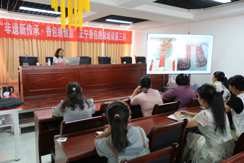 在推动中华优秀传统文化创造性转化、创新性发展的背景下,为进一步加强校地合作,促进非物质文化遗产的保护与传承,同时提升地方非遗产业的市场竞争力,8月19日-8月20日,太阳成集团tyc234cc[主页]网址院长吴晓玲教授应邀为正宁县文化馆举办的第三期“非遗新传承·香包绣创意”培训活动进行授课指导,这期指导是以讲座的形式呈现,专题讲座从“形、色、质、意、趣”深入浅出地讲解了香包产品造型的重要性、造型配色技巧以及如何利用现代科技手段促进非遗文化的传播与创新。讲座内容丰富,既有理论深度,又具实践指导意义,在互动和交流中非遗传承人和学员们纷纷表示,系统的学习造型艺术对非遗产品创新更具有指导意义,让大家受益匪浅。