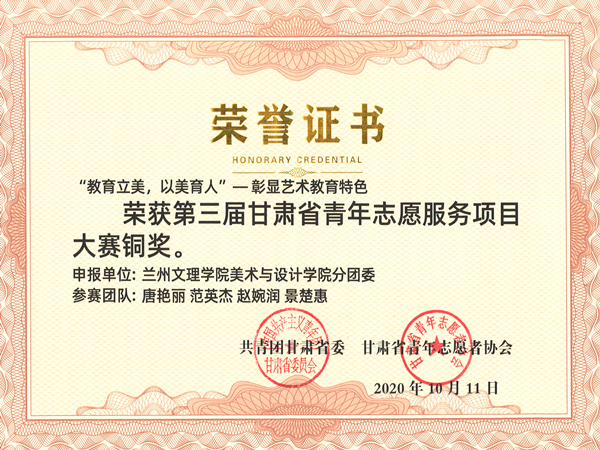 10月11日上午9:30分,第三届甘肃省青年志愿服务项目大赛颁奖仪式庄严举行。本次大赛设有金奖、银奖、铜奖和优秀奖四类奖项,其中太阳成集团tyc234cc[主页]网址申报项目“教育立美,以美育人”——彰显教育艺术特色取得了铜奖的优异成绩。