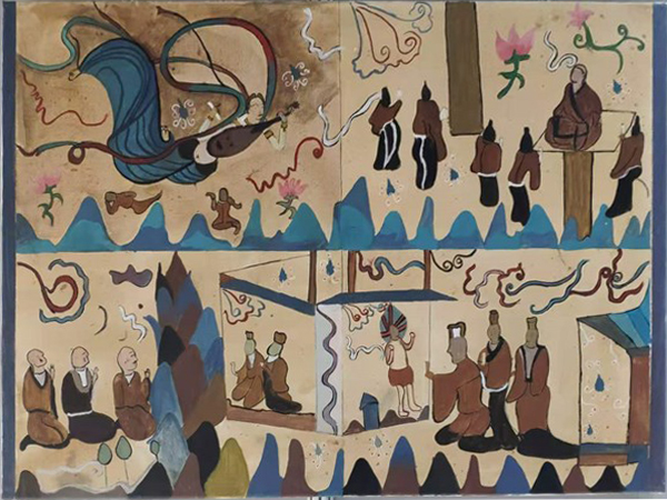 从敦煌壁画到现代装饰壁画,学生们完成了从佛国世界到抽象表现、传统到现代、传承到创新的理解和演变。值得一提的是课程后期实施以模拟壁画项目教学方法,让学生通过壁画项目具体的测量、设计、预算等内容进行实践,效果显著。