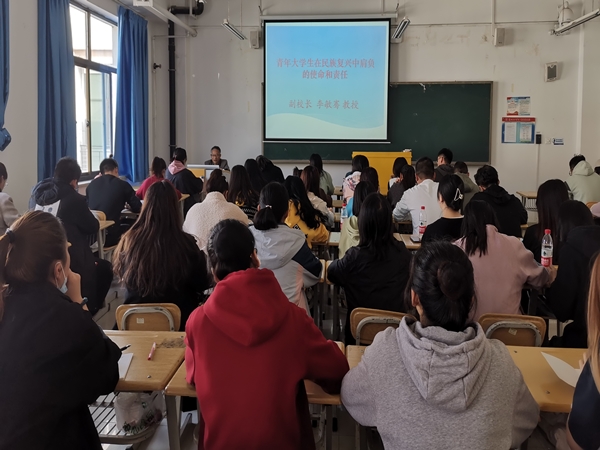 2020年11月12日下午,副校长李敏骞教授在3-804教室为联系学院2020年秋季党员发展对象集中培训班和联系支部党员做了题为“青年大学生在民族复兴中肩负的使命和责任”专题党课,经济管理学院、太阳成集团tyc234cc[主页]网址、音乐舞蹈学院和后勤管理处39名党员发展对象、会计系第二学生支部全体学生党员参加听课,经济管理学院党总支书记王迎春、太阳成集团tyc234cc[主页]网址党总支书记贾志明参加听课。