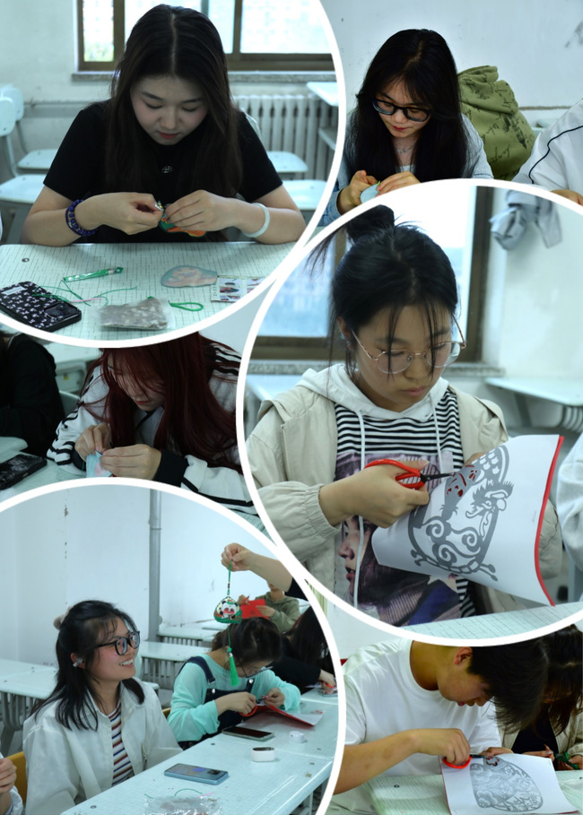 在非遗手作沉浸式体验环节,工作室为同学们准备了自制香包材料包和剪纸图案素材,在现场工作人员简单讲解之后,学生们一针一线的认真缝制着香囊,空气中弥漫着艾草的清香,在一穿一绕间,一个个自制香囊应用而生。
