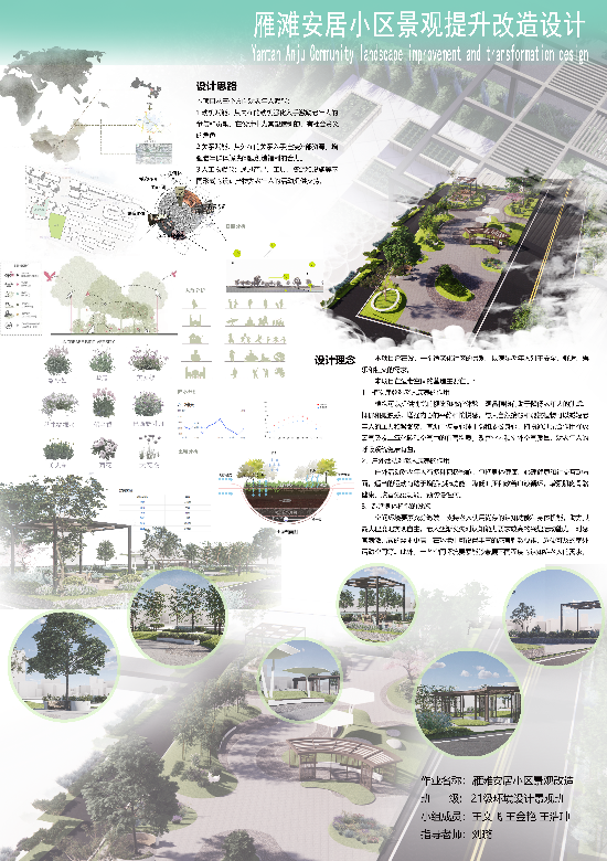 本次课程是同学们对兰州雁滩安居小区内景观空间的深入考察与改造设计成果。通过实地考察,与小区居民、物业管理人员等进行沟通,对小区内的景观空间现状与居民期待有了更加直观和深入的了解,为设计的展开提供了依据。依托整个设计过程,同学们学会了如何将理论知识与实践相结合,不仅提高了自己的专业技能和综合素质,还为未来的职业发展奠定了坚实的基础。