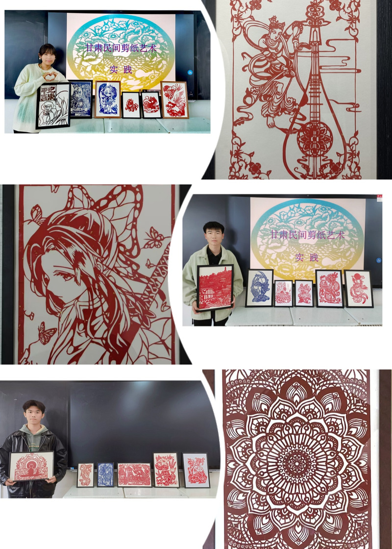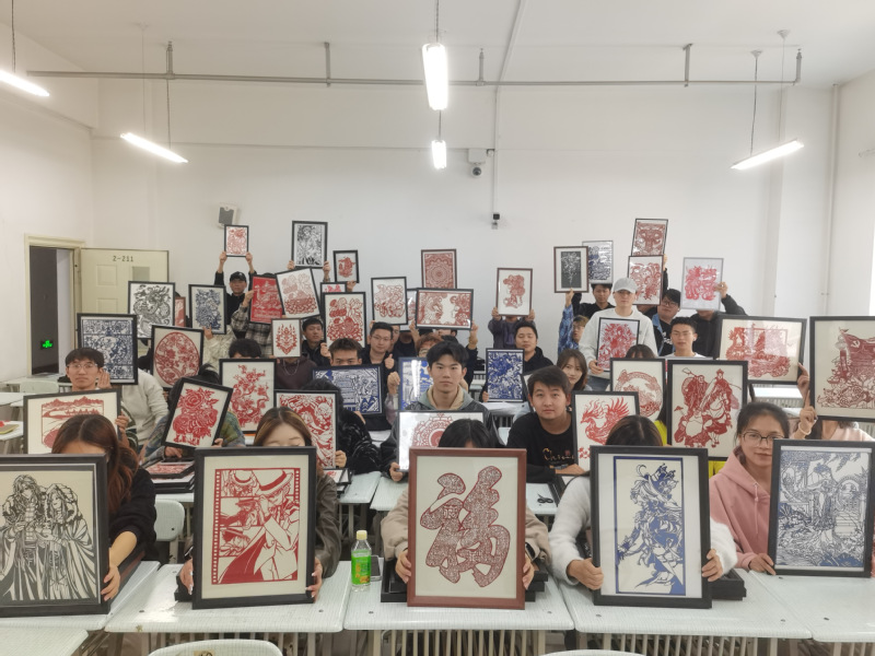 本次课程采用智慧树慕课平台,以线上视频讲授理论,线下项目化实践主题教学为主。此次展览共展出剪纸作品200余幅,作品以民间吉祥图案、花鸟鱼虫、十二生肖、戏剧人物为主要题材,通过剪纸的形式把皮影、戏曲脸谱、经典工笔画局部元素作为创作素材,丰富了剪纸艺术的表现形式。