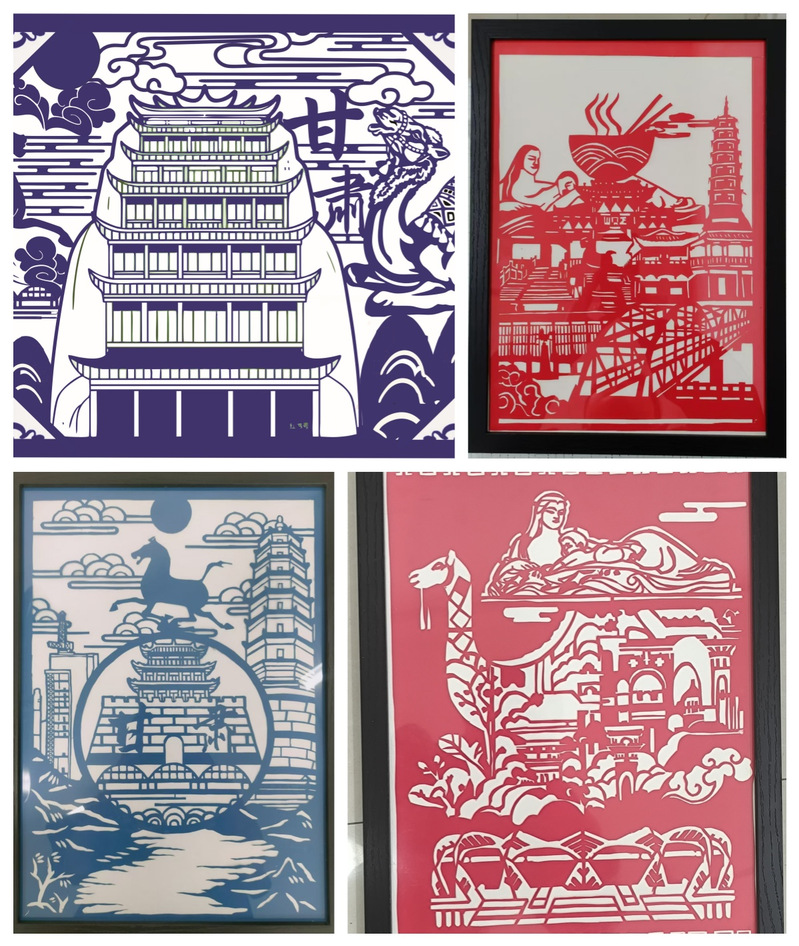在剪纸应用方面,唐老师要求每个同学根据自己的喜好,应用作图工具设计一张属于自己的剪纸,同学们以兰州城市景观、动漫人物、敦煌莫高窟标志性建筑、飞天人物以及自画像等主题经过设计重构,一件件古朴端庄栩栩如生的剪纸作品应用而生,同学们在设计与实践的过程中践行了传统与创新的结合。