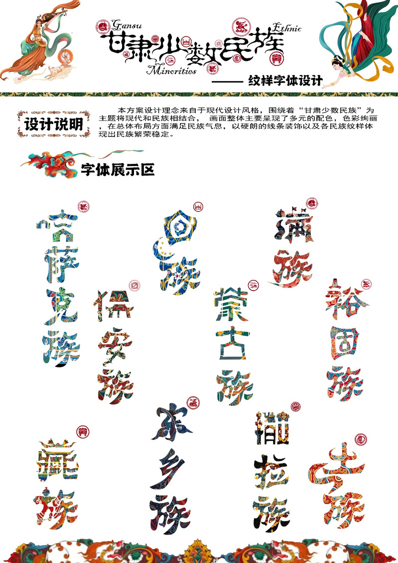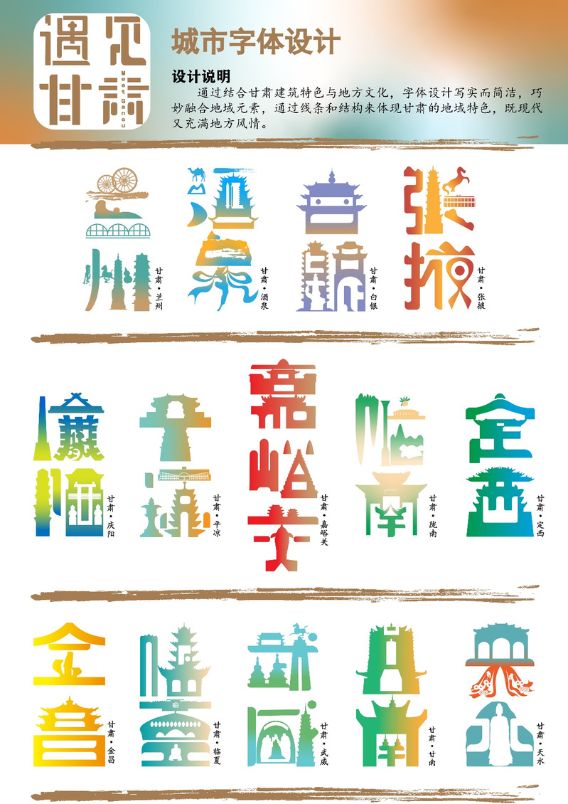 本次课程作业汇报展汇集了字体设计、版式编排等实践项目内容。同学们运用不同的设计手法表现自己的设计作品,展现出自己对专业学习的理解与感悟。课程以“字体”为载体,以“甘肃文化”为主题,通过对“甘肃地域文化”的设计编排,启发同学们思考如何将自己所学的知识运用到实际生活中,并通过与他人的交流学习获得更多的灵感。