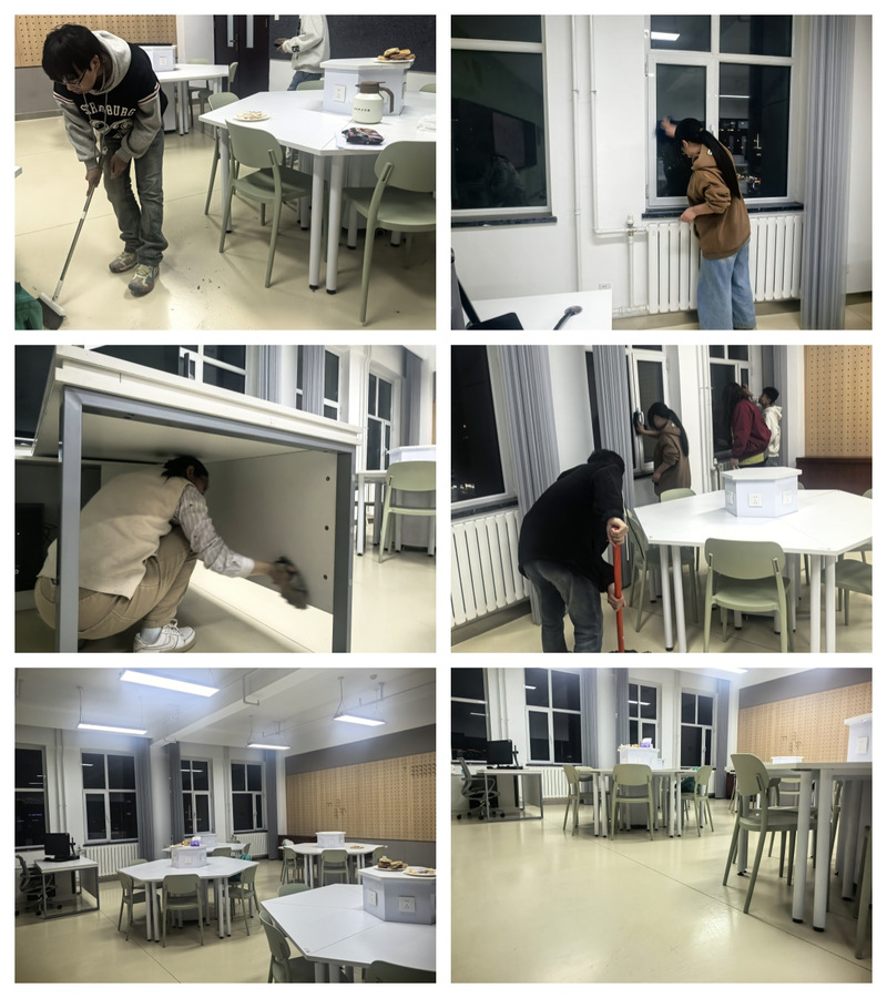 作为活动的重要环节,24视传的同学们在整理师的带动下715教室进行深度清洁与整理。师生分工协作,分别对桌面、立面和家具物品三大类空间和对象进行了深度清理:彻底清理地面垃圾、桌面灰尘及窗户死角,将教学用具、学生作品分类存放。