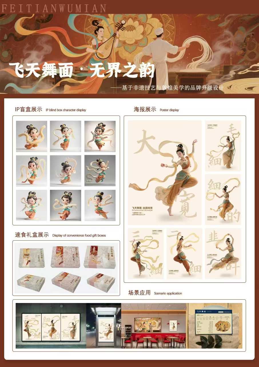 我院获奖作品《飞天舞面·无界之韵:非遗技艺与敦煌品牌美学升级设计》由吴晓玲教授、孙博文副教授共同指导,视觉传达设计专业学生吴蕊婷、祁羡惠与北京理工大学研究生刘小麦共同完成。该作品以敦煌飞天艺术为灵感,深度融合兰州牛肉面非遗技艺,实现了文化符号与餐饮体验的创新结合。作品聚焦当前传统文化与餐饮融合中普遍存在的表面化、碎片化问题,提出以“飞天失重美学”呼应拉面“重力技艺”的哲学理念,构建出兼具视觉张力与文化叙事的品牌升级方案。通过提炼飞天壁画的线条、色彩与动态,开发出贯穿视觉形象、空间营造、互动菜单及周边产品的系统设计,通过传播“丝路文化”增强了区域品牌的识别度和文化附加值。