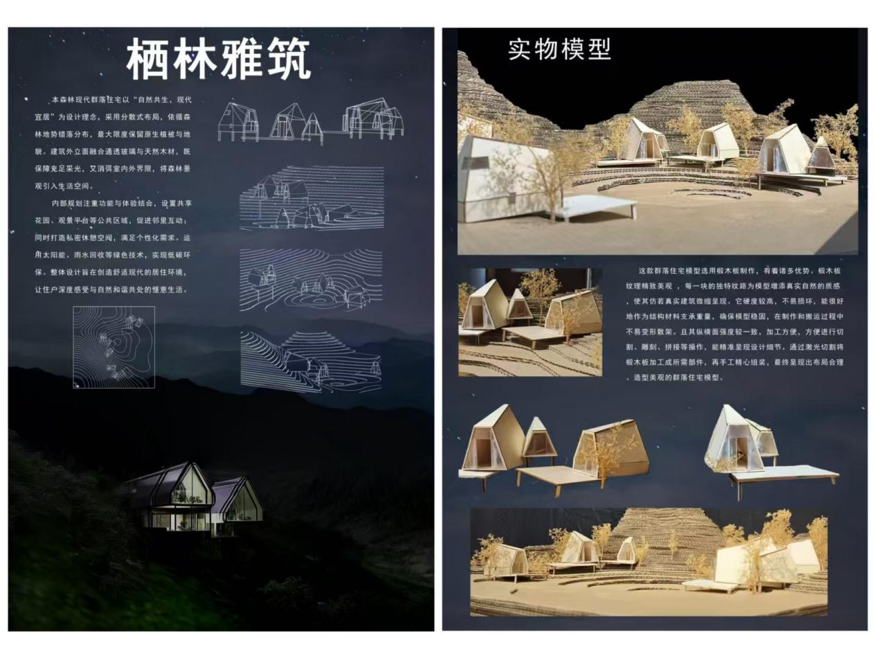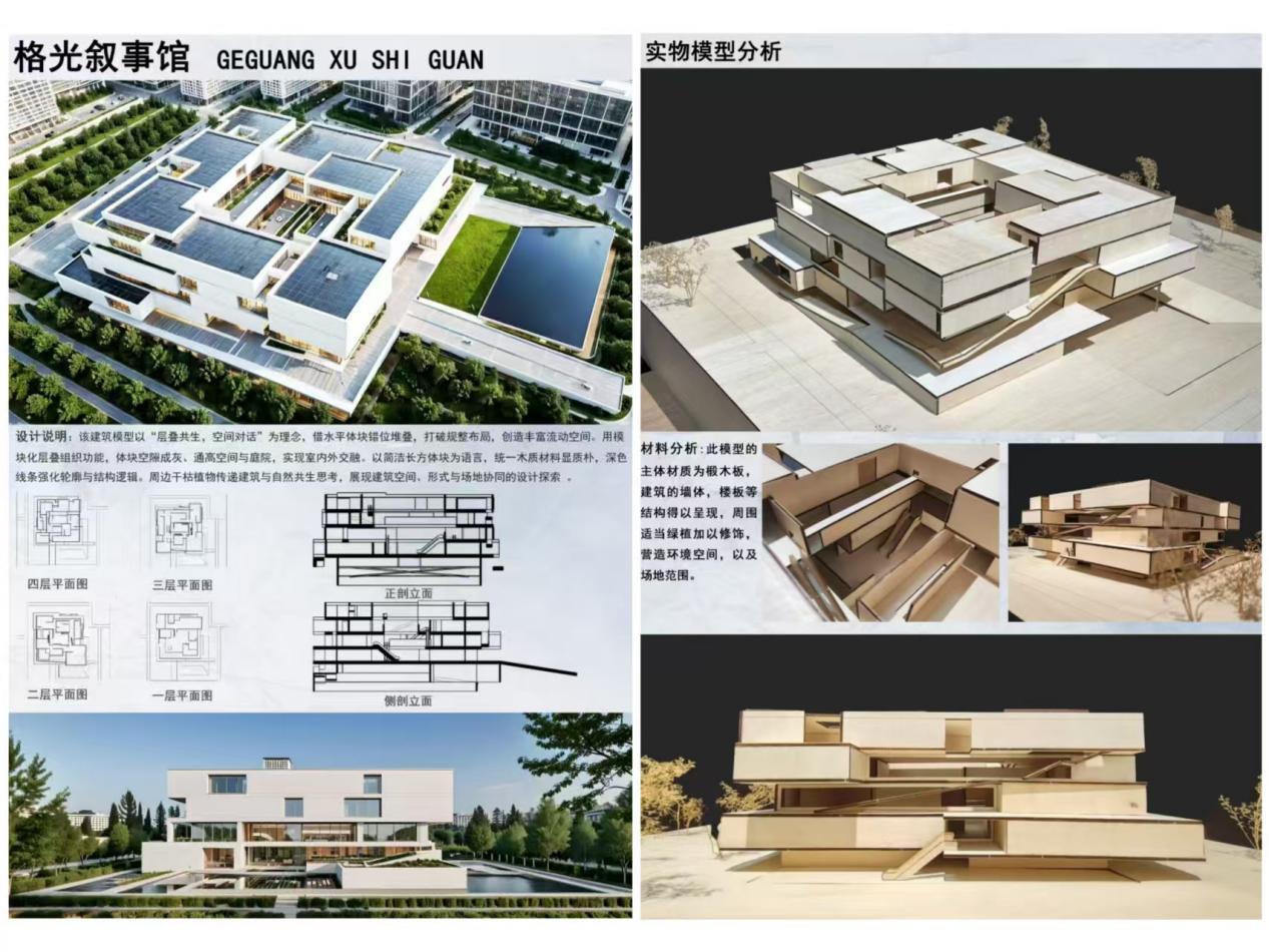 课程初期,教师介绍了当前常用的建筑软件与AI辅助设计工具,引导学生运用AI技术生成概念方案,掌握基础的数字创作技能。随后,通过系统讲解模型制作的基本概念、分类、常用工具与材料等理论知识,学生逐步建立起完整的模型制作知识框架。在项目实践环节,学生通过动手操作,提升了空间想象能力与手工表达能力,学会依据材料特性优化设计方案,并将创意转化为实体模型。在整个设计与制作过程中,课程注重培养学生独立思考、团队协作与实践操作的综合专业素养。